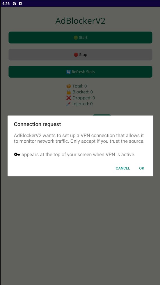 How it works: AdBlocker V2 creates a local VPN tunnel on your device. It does NOT send your traffic to a remote server. Instead, it inspects connection requests against a massive database of known trackers and ad-servers. If a match is found, the connection is safely dropped before it can reach your browser or apps.